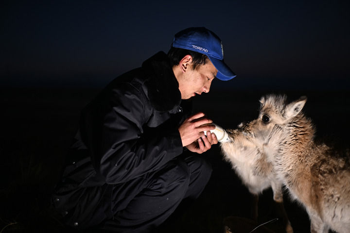 在索南達(dá)杰保護(hù)站,可可西里巡山隊(duì)隊(duì)員在給被救助的藏羚羊幼仔喂奶(2023年7月28日攝)。新華社記者 張宏祥 攝