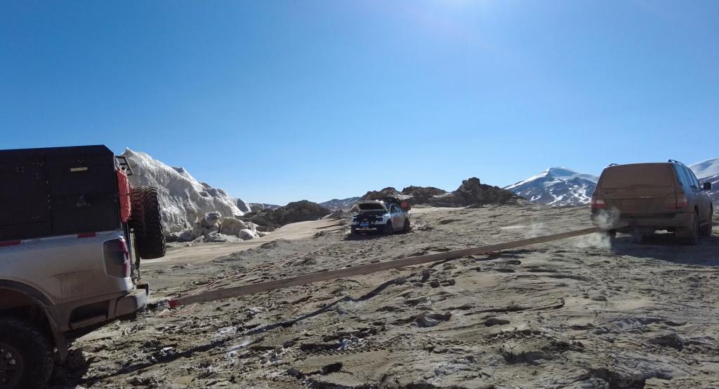 可可西里巡山隊隊員在巡山過程中用拖車繩拉出被困車輛(2025年1月14日攝)新華社發(fā)