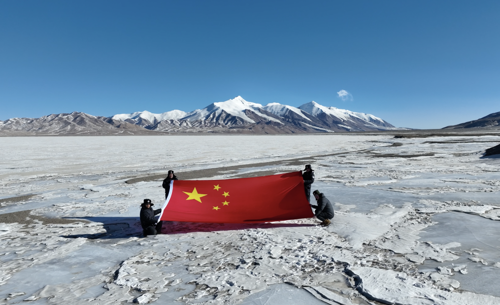 巡山隊(duì)員在可可西里無(wú)人區(qū)腹地的太陽(yáng)湖湖邊,展開一面五星紅旗,這面國(guó)旗曾于2021年10月2日在天安門廣場(chǎng)升起。(攝于2025年1月14日)新華社發(fā)