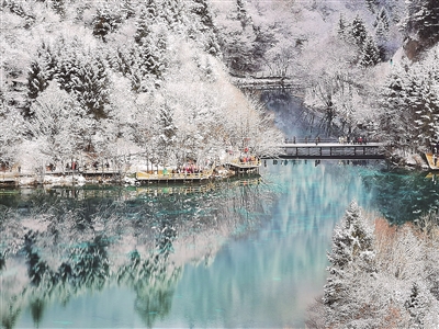 2025年1月20日,中外游客在四川九寨溝景區(qū)五花海游覽。宋豪新 攝