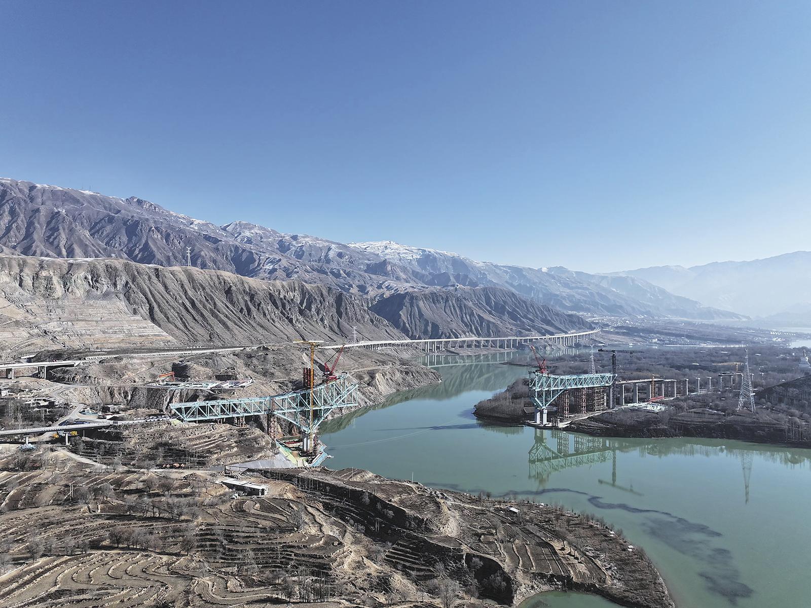 尖扎黃河特大橋長1596.20米,寬15米,其中,主橋全長648米,為141米+366米+141米三跨連續(xù)鋼桁系桿拱橋,是目前世界最大跨度雙線鐵路連續(xù)鋼桁拱橋,也是首座跨越黃河的鐵路鋼桁拱橋。