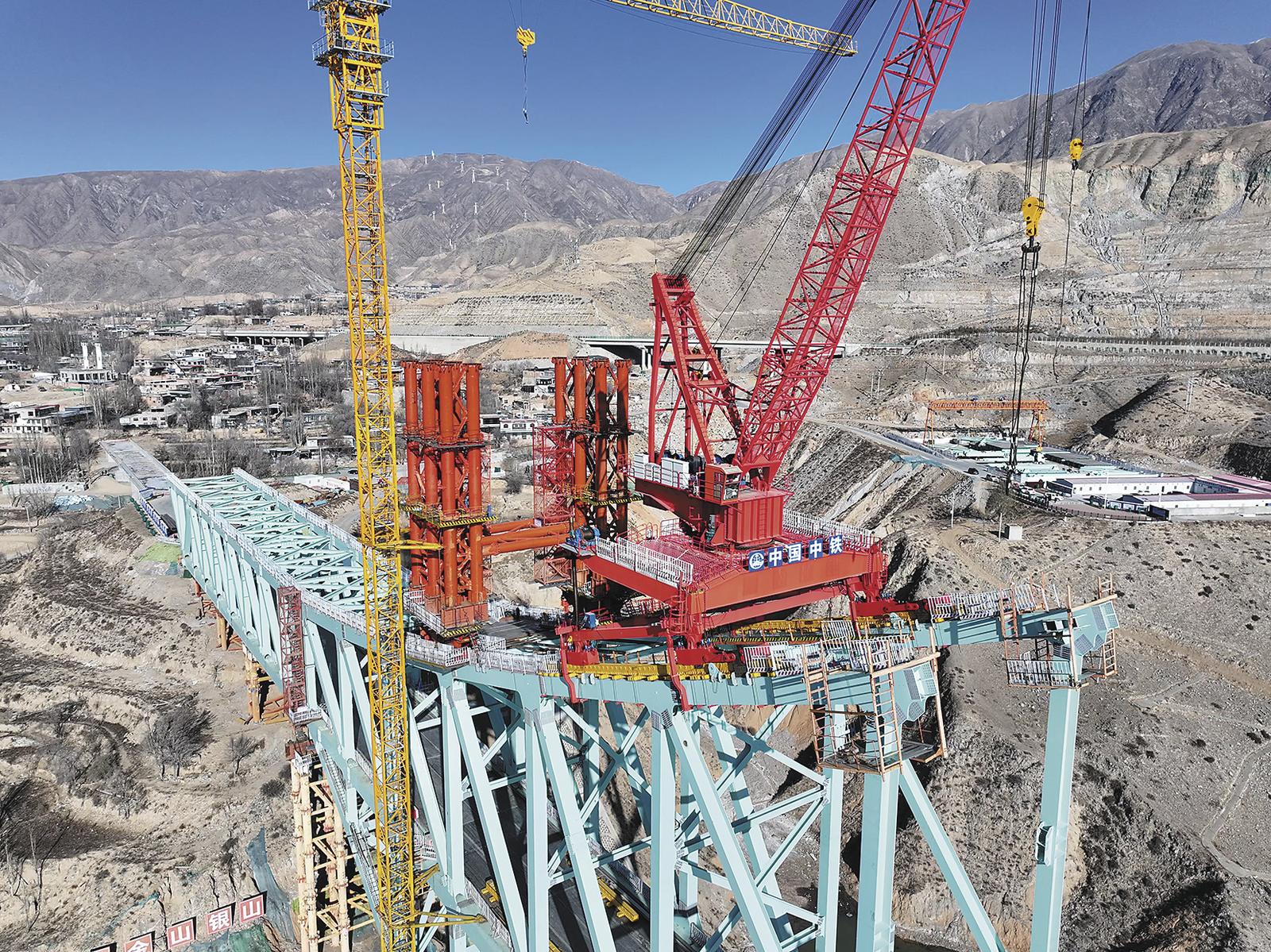 “川青鐵路尖扎黃河特大橋主橋鋼桁拱架設(shè)進度過半。”看著這一片熱火朝天、有序建設(shè)的場景,川青鐵路11標中鐵大橋局項目黨支部書記瞿小荃滿懷信心地介紹起項目進度,“黃河北岸已經(jīng)完成第14節(jié)間架設(shè),南岸完成第12節(jié)間架設(shè),主橋需要完成50個節(jié)間,目前共完成26個節(jié)間架設(shè)。”