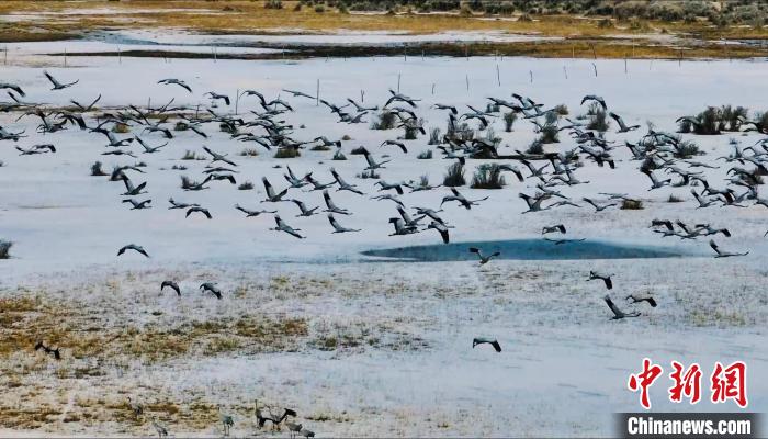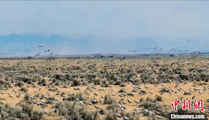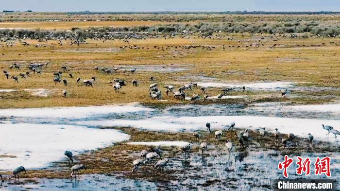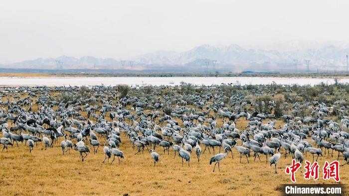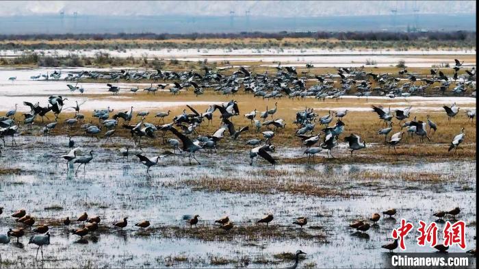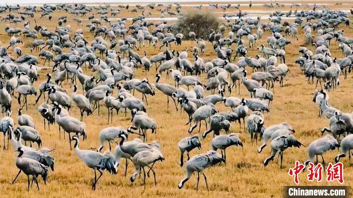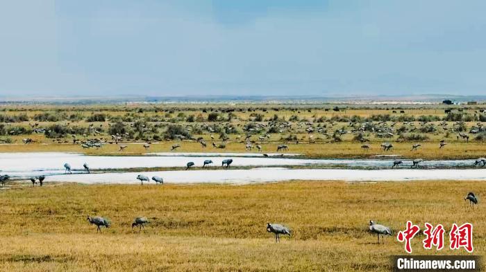 連日來,成群灰鶴聚集于青海省海西蒙古族藏族自治州都蘭縣巴隆鄉(xiāng)鐵絲蓋地區(qū)。灰鶴是國家二級重點保護野生動物。