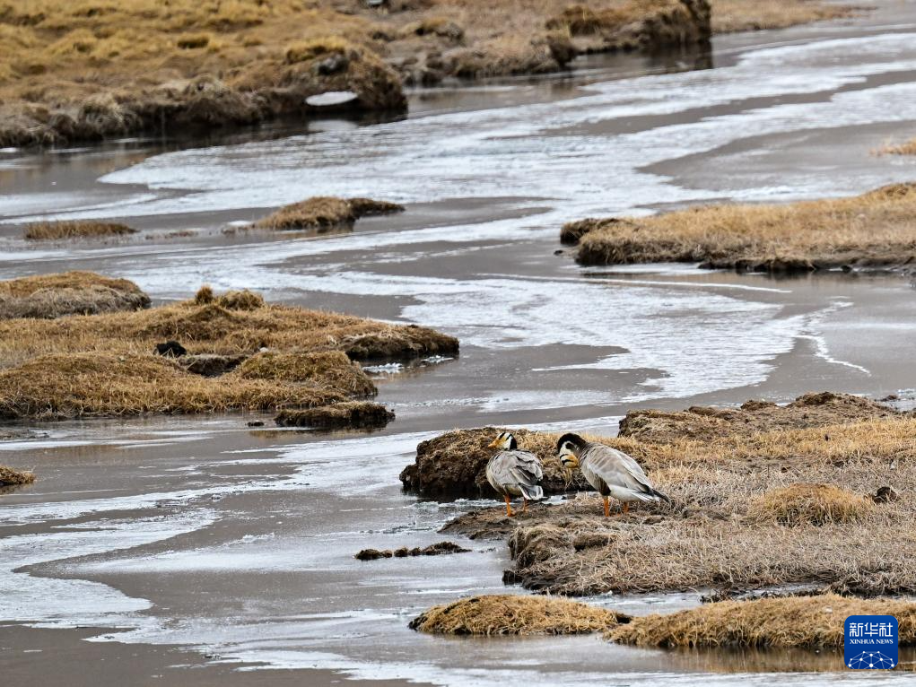 4月8日,兩只斑頭雁在青海隆寶國家級(jí)自然保護(hù)區(qū)內(nèi)活動(dòng)。新華社記者 張龍 攝
