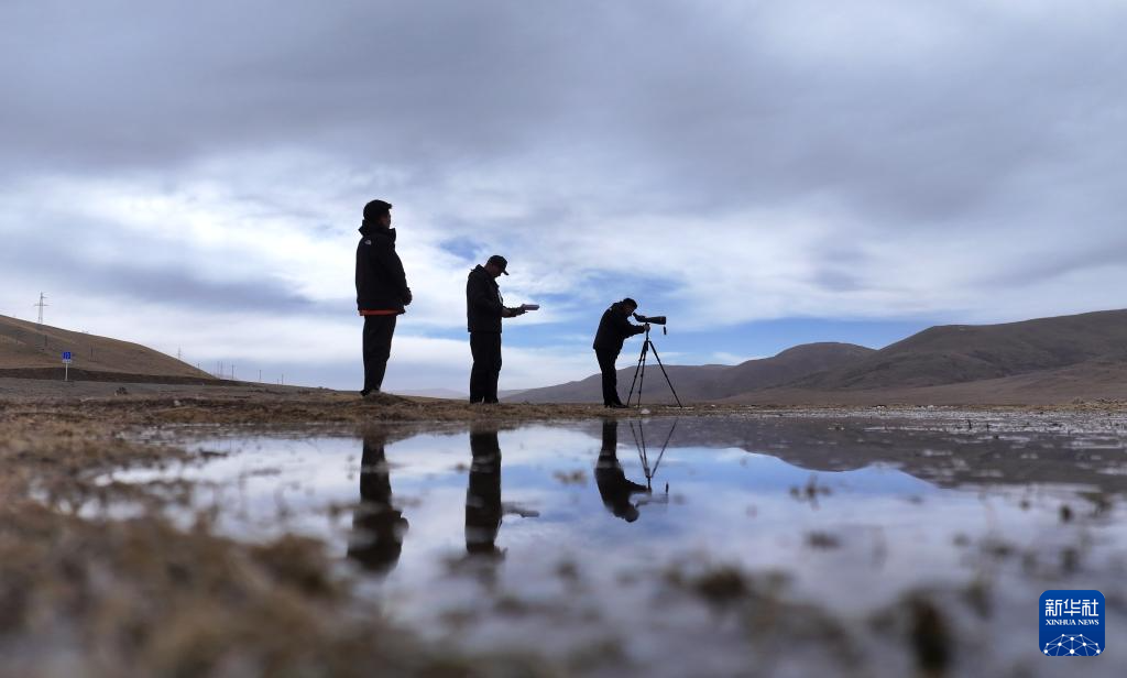 4月8日,青海隆寶國家級(jí)自然保護(hù)區(qū)生態(tài)管護(hù)員才仁多杰(右一)和同伴一起觀測候鳥(無人機(jī)照片)。新華社記者 張宏祥 攝
