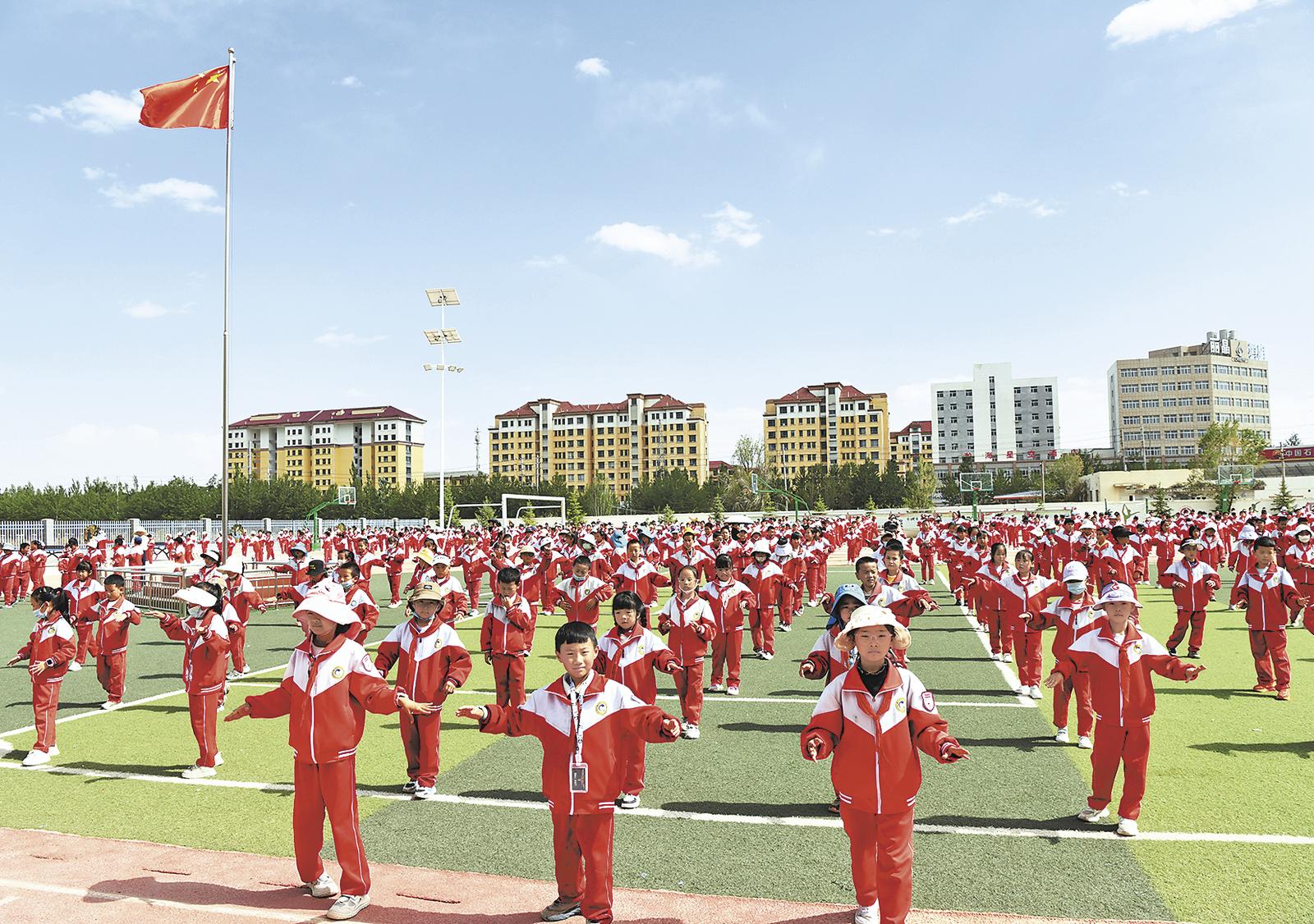 下午課間操時分,伴隨著歡快的音樂聲,學(xué)生們迅速在操場上列隊站好,他們臉上洋溢著燦爛的笑容,腳步輕盈地跳起學(xué)校特色的“民族團結(jié)操”,孩子們時而張開雙臂像雄鷹展翅,時而彎腰轉(zhuǎn)身似駿馬奔騰。