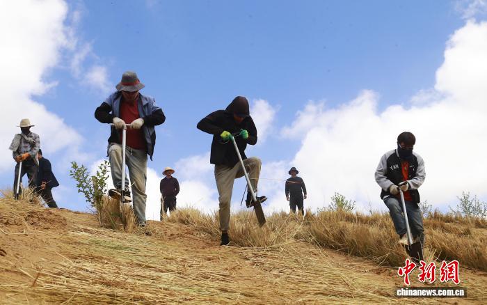 資料圖為青海省海南藏族自治州貴南縣黃沙頭國家沙漠公園內(nèi),當(dāng)?shù)孛癖妳⑴c沙漠治理,鋪設(shè)草方格。馬銘言攝