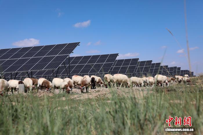 資料圖為青海省海南藏族自治州共和縣塔拉灘光伏產(chǎn)業(yè)園區(qū)內(nèi),“光伏羊”在光伏板下吃草。馬銘言攝