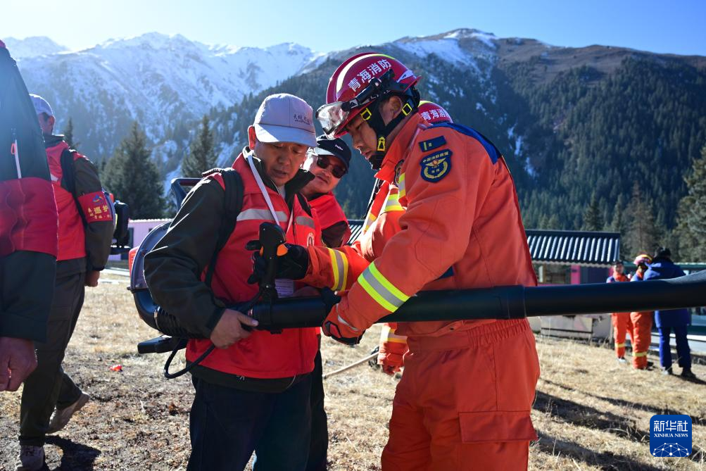 11月8日,在青海省海北藏族自治州祁連縣阿咪東索林區(qū),祁連縣消防救援大隊消防員(右一)指導當?shù)刈o林員使用森林草原滅火救援裝備。新華社記者 齊芷玥 攝