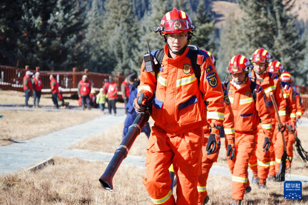 11月8日,在青海省海北藏族自治州祁連縣阿咪東索林區(qū),祁連縣消防救援大隊消防員準備向護林員演示森林草原滅火裝備的操作方法。新華社記者 齊芷玥 攝