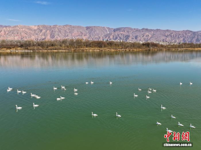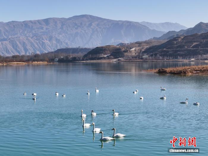 12月11日,大天鵝在青海省黃南藏族自治州尖扎縣黃河流域自在游弋。隨著當(dāng)?shù)厣鷳B(tài)環(huán)境持續(xù)向好,每年都會(huì)有成群的大天鵝在此越冬,冬日黃河盡顯生機(jī)。中新社記者 馬銘言 攝