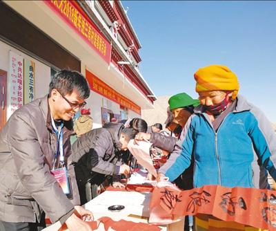 1月7日,第八批援藏干部中的20多名書法愛好者和西藏自治區(qū)書法家協(xié)會部分會員來到位于拉薩河畔的曲水縣三有村,為當?shù)?84戶藏漢群眾現(xiàn)場寫福字,送春聯(lián)。