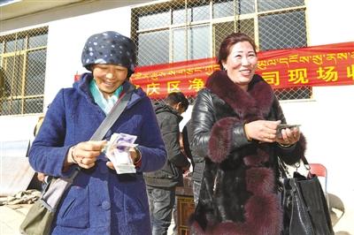 兩位群眾開心地?cái)?shù)著售賣黑青稞所得的錢。李洲 攝