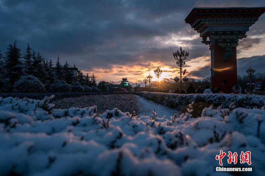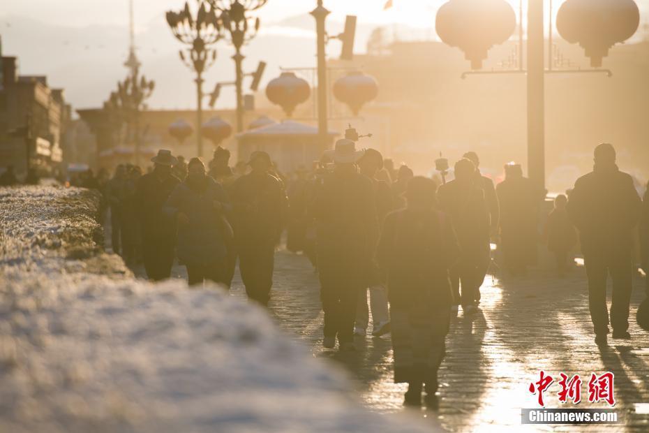 3月10日凌晨時(shí)分,雪域“圣城”拉薩的天空飄起片片雪花,迎來了今年的又一場降雪。3月的春雪為拉薩披上一層“薄紗”,銀裝素裹景色迷人。圖為雪后,拉薩民眾迎著朝陽出行。 文/曾嘉 圖/何蓬磊