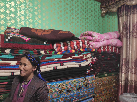 如今,卓瑪家有三層樓,除了自家居住,二樓、三樓提供住宿,一共8間房,可以住16位客人。一樓代賣當(dāng)?shù)氐奶厣a(chǎn)品,柜臺(tái)里,門巴木碗、糌粑、蕎麥酒等擺放整齊。照應(yīng)客人的閑暇,卓瑪還會(huì)做一些毛線手工編織售賣。算下來,一年的收入有10萬(wàn)多元。