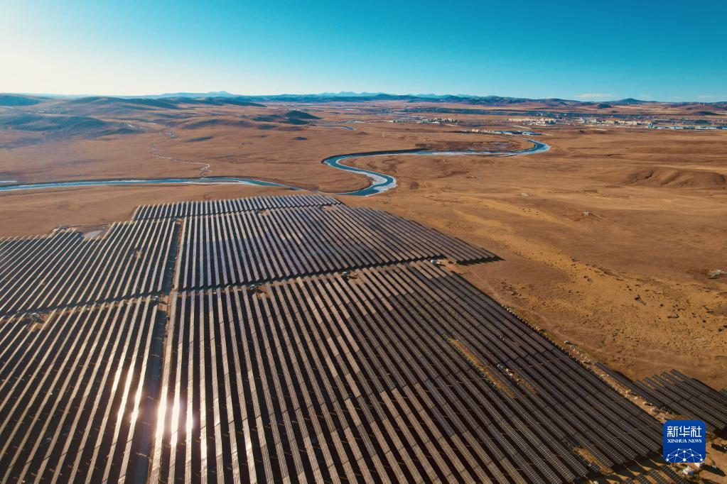 在平均海拔約4500米的西藏自治區(qū)那曲市色尼區(qū),寒風呼嘯,工人們干勁十足。藍天白云下,陽光灑在一排排光伏板上,儲能系統(tǒng)與電網(wǎng)塔基開始送電,成為藏北草原的“活力動能”。