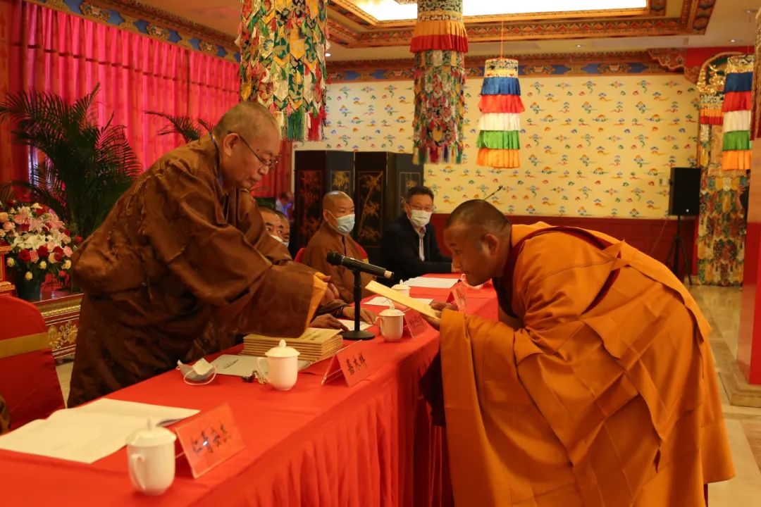 中國佛教協(xié)會(huì)副會(huì)長、藏傳佛教學(xué)銜工作指導(dǎo)委員會(huì)主任、中國藏語系高級(jí)佛學(xué)院院長嘉木樣活佛向“拓然巴”高級(jí)學(xué)銜獲得者頒發(fā)學(xué)銜證書。中國佛教協(xié)會(huì)副會(huì)長、藏傳佛教學(xué)銜工作指導(dǎo)委員會(huì)副主任珠康·土登克珠活佛向“拓然巴”高級(jí)學(xué)銜獲得者表示祝賀。