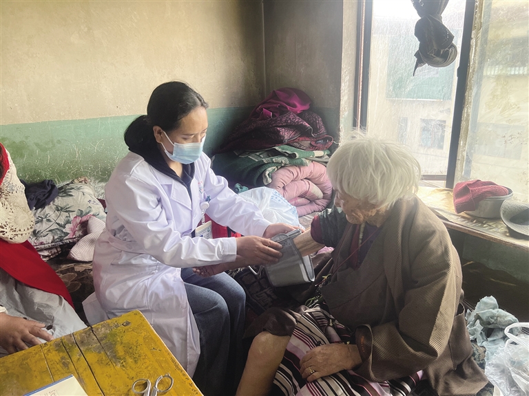 交談中,仁措向社區(qū)工作人員表示,自己的腿有些不舒服。工作人員發(fā)現(xiàn),老人的腿有些微微浮腫,便急忙下樓自掏腰包為老人購買了兩雙拖鞋。“嬤啦,在家你就穿這個(gè)拖鞋,會(huì)舒服一點(diǎn),衣服我們拿回去給你洗了,等晾干了我們?cè)俳o你送回來。”多番叮囑后,大家才離開。扎西尼瑪表示,社區(qū)工作人員會(huì)將獨(dú)居老人當(dāng)成自己的家人來照顧,在有形的服務(wù)中,融入無形的陪伴,用心守護(hù)獨(dú)居老人。