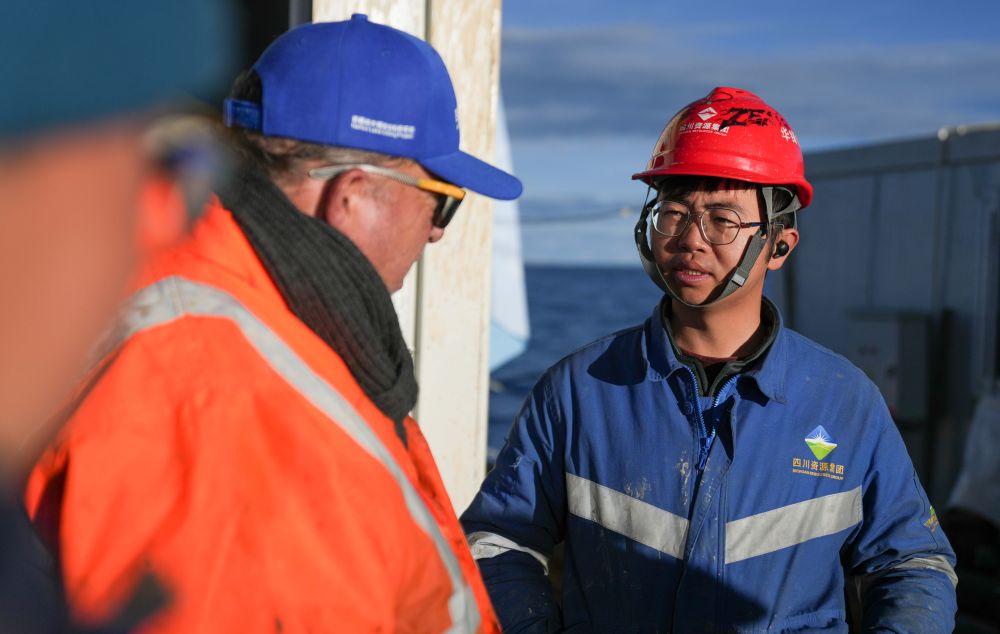 7月12日,鉆探隊(duì)員曾邦祐(右)在協(xié)助外國鉆探技術(shù)指導(dǎo)與鉆探隊(duì)進(jìn)行溝通。新華社記者 晉美多吉 攝