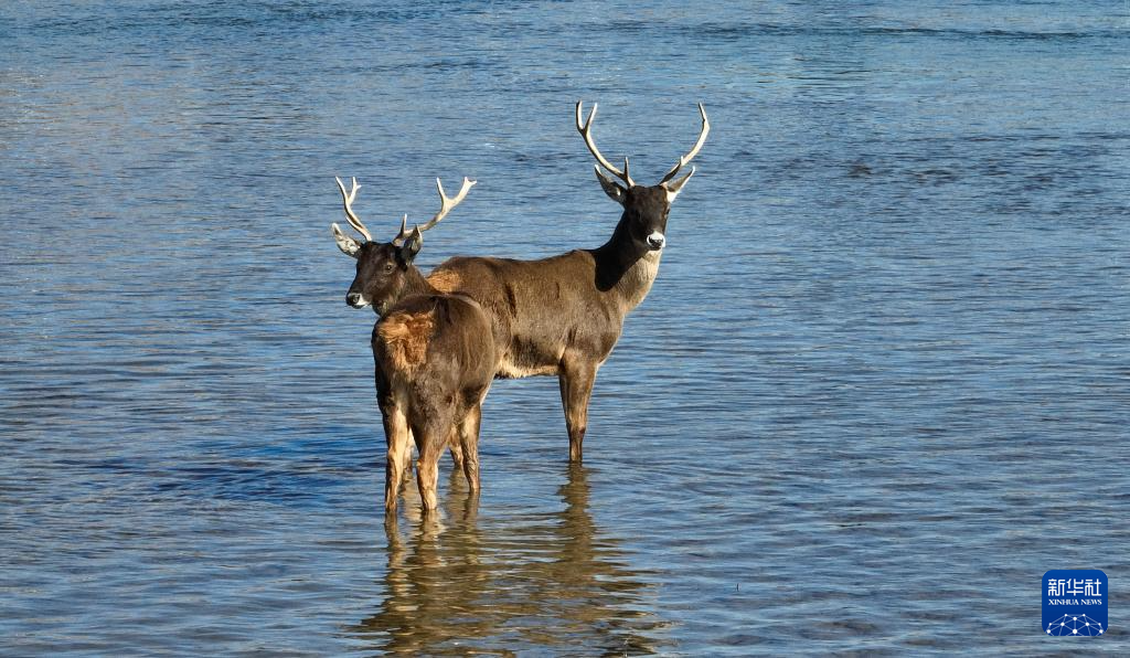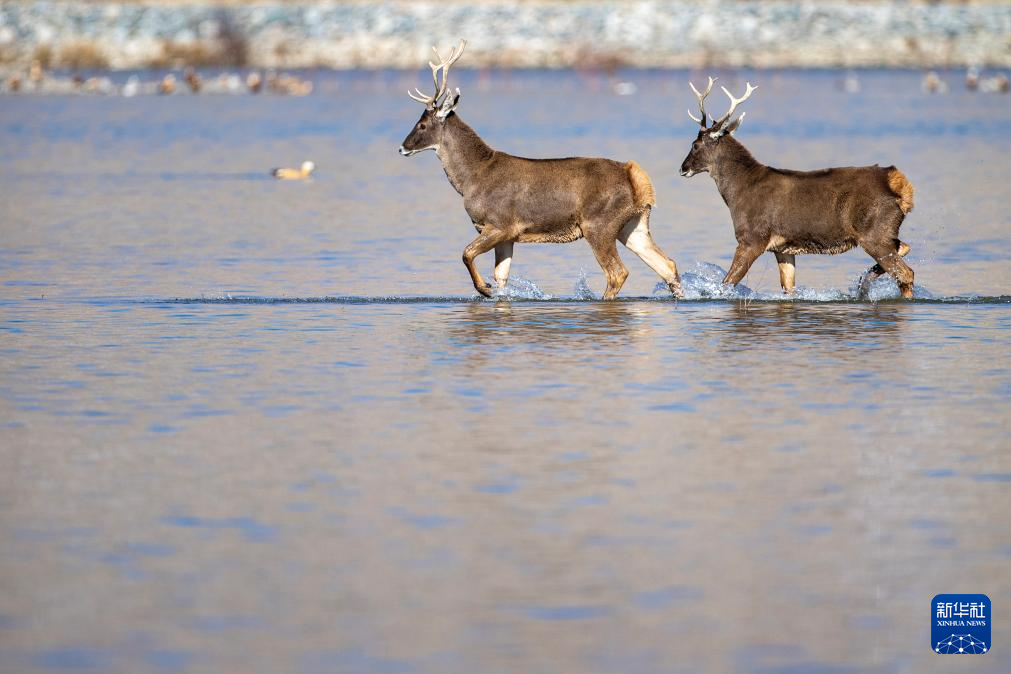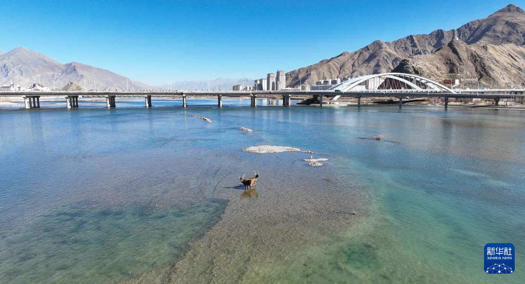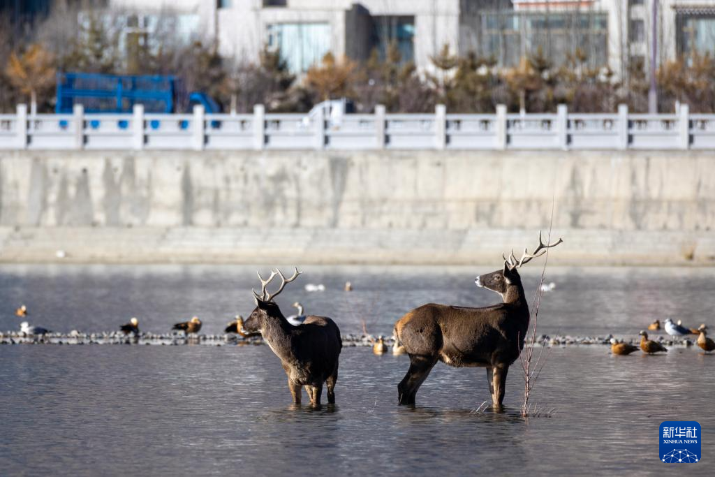12月23日,兩只亞成體雄性白唇鹿出現(xiàn)在流經(jīng)拉薩城區(qū)的拉薩河中。新華社記者 姜帆 攝