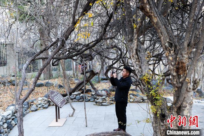 圖為游客在曲孜卡鄉(xiāng)的古葡萄藤前拍照。薛蒂 攝