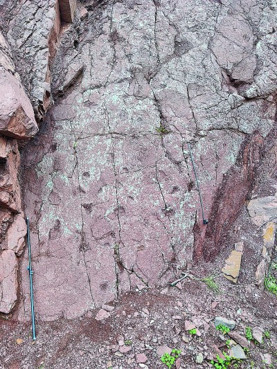 西藏昌都位于青藏高原東部,據(jù)介紹,此研究區(qū)的侏羅紀(jì)地層最大厚度超過4800米,巨大的沉積厚度促進(jìn)了大量化石的發(fā)現(xiàn),其中就包括恐龍足跡化石。2023年7月,中國地質(zhì)調(diào)查局自然資源實(shí)物地質(zhì)資料中心項(xiàng)目組于昌都開展工作時(shí),在凍多村一段鄉(xiāng)村道路兩側(cè)的石壁上發(fā)現(xiàn)了疑似爬行動物腳印,隨即與遺跡學(xué)專家合作組成考察隊(duì)開展研究。該足跡化石點(diǎn)頂部為灰?guī)r,由紫紅色砂巖間夾頁巖、黏土巖組成,含有植物化石、遺跡化石和少許腕足、介形類和海百合莖等化石,總體屬于海陸交互環(huán)境??疾礻?duì)在恐龍足跡所在層面與相鄰層面還發(fā)現(xiàn)了如古藻跡、石針跡等遺跡,這些發(fā)現(xiàn)代表這個(gè)地方曾是淺水環(huán)境。因此,研究證明,良好的環(huán)境和豐沛的水資源吸引了恐龍等動物在此活動,并留下豐富的足跡化石。