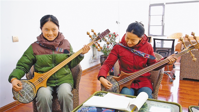 大學(xué)生志愿者在演示六弦琴?gòu)椬唷Mㄓ崋T 王利軍 攝