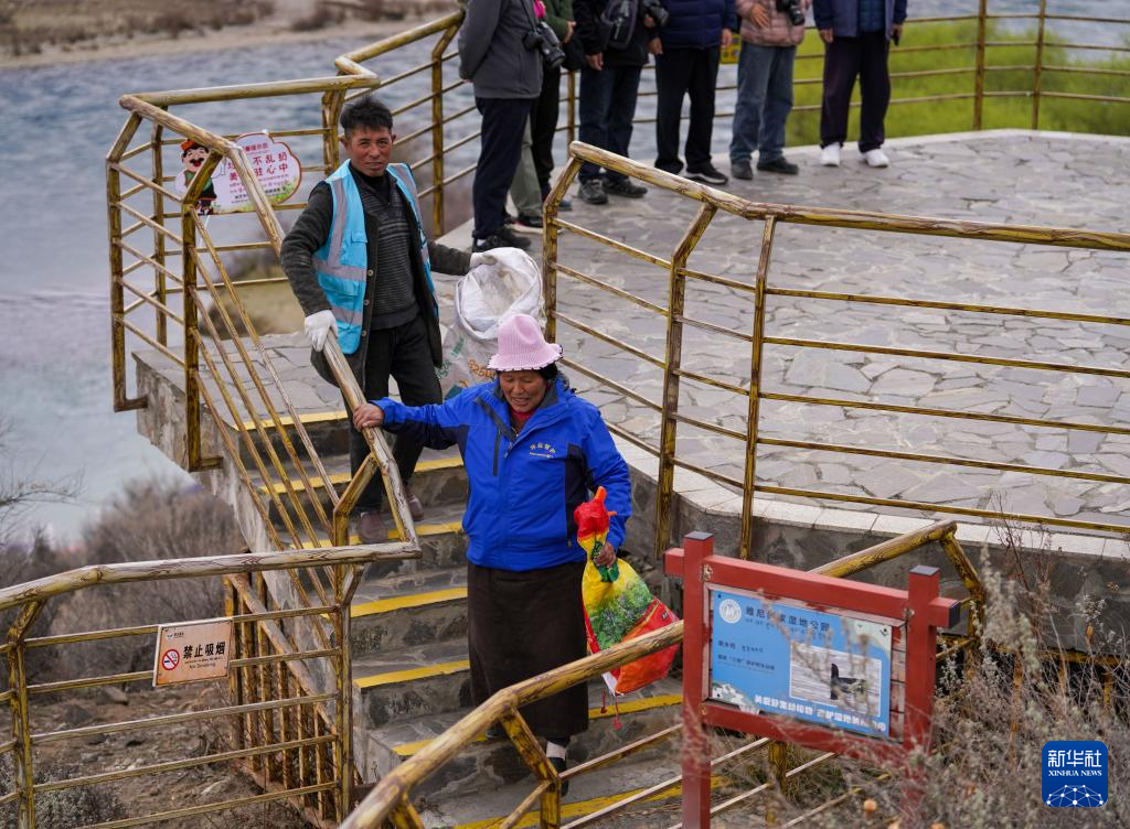 4月4日,雅尼國家濕地公園管護員在巡護途中清理垃圾。新華社記者 丁增尼達(dá) 攝