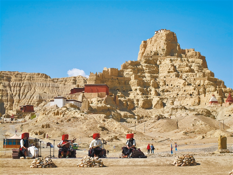 圖為5月19日,朵熱樂隊(duì)在札達(dá)縣古格王國遺址前彈奏民俗樂曲。記者 洛桑旦增 攝