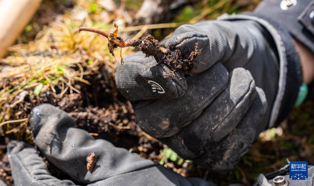 這是在那曲市索縣西昌鄉(xiāng)拍攝的剛采挖出的蟲草(5月18日攝)。新華社記者 丁增尼達(dá) 攝