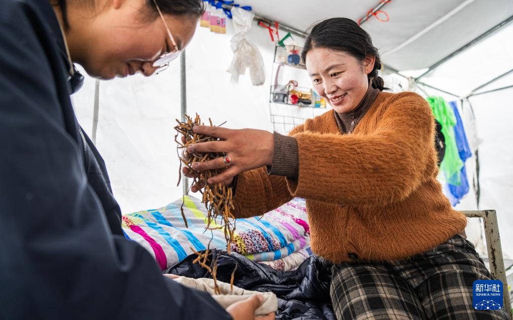 在那曲市索縣西昌鄉(xiāng),牧民將清理好的蟲草裝袋收納(5月18日攝)。新華社記者 丁增尼達(dá) 攝