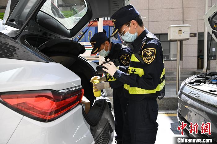 圖為西藏自治區(qū)日喀則市吉隆縣的吉隆口岸,海關(guān)工作人員在對出口的國產(chǎn)新能源汽車進(jìn)行檢查。貢嘎來松 攝