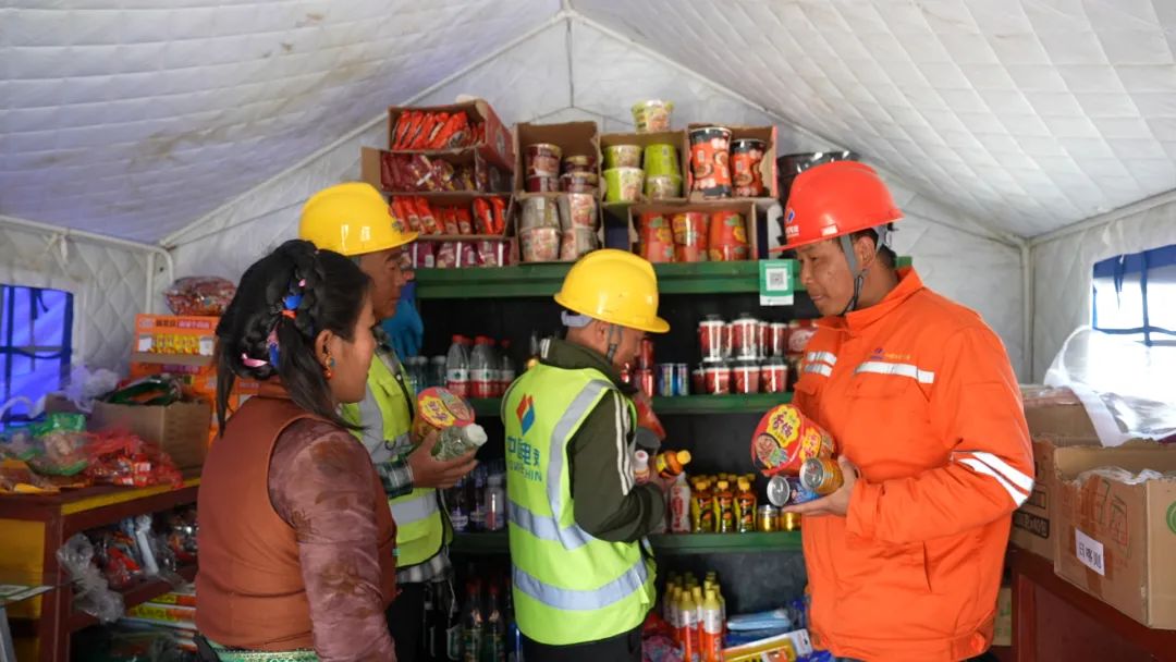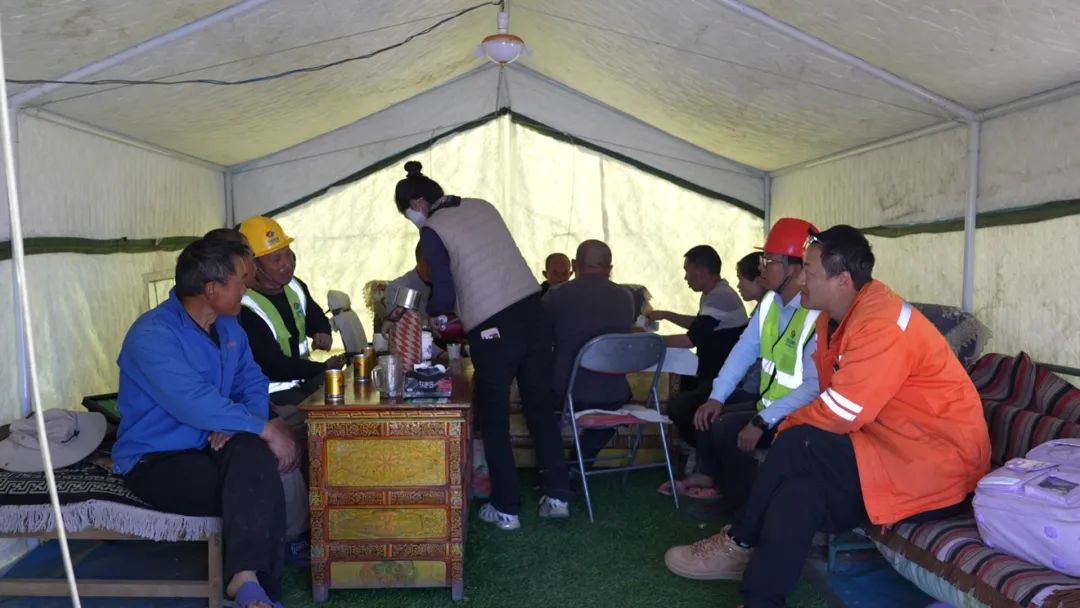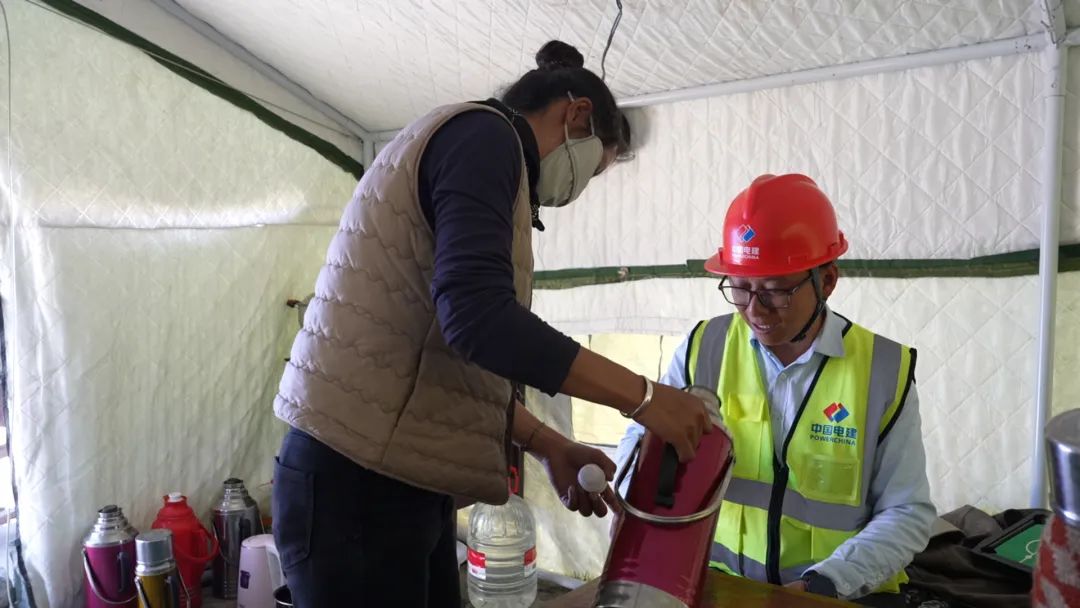 茶館主人巴桑,是村里有名的熱心人??粗┕と藛T為重建家園奔波,采購物資不便,她果斷在項目部生活區(qū)旁開起小賣鋪。與工人們熟絡后,她又搬來桌椅,搭起簡易帳篷茶館,只為給異鄉(xiāng)人一個歇腳放松之處。