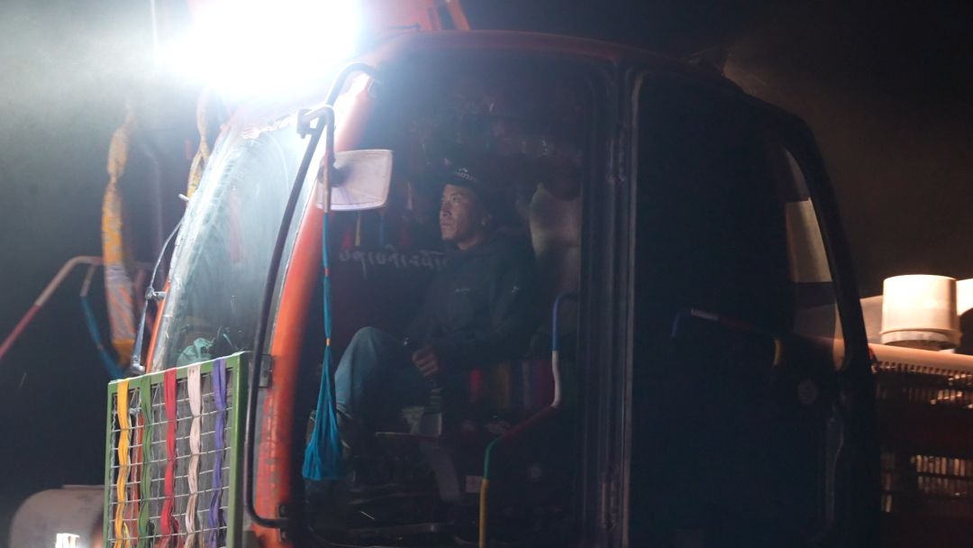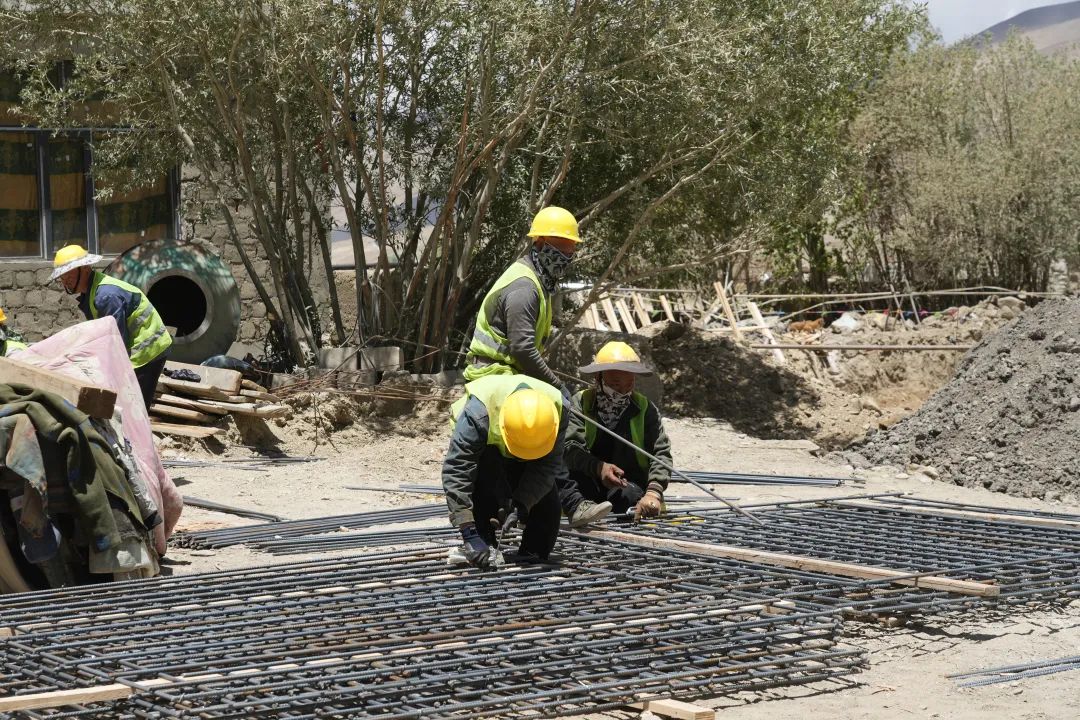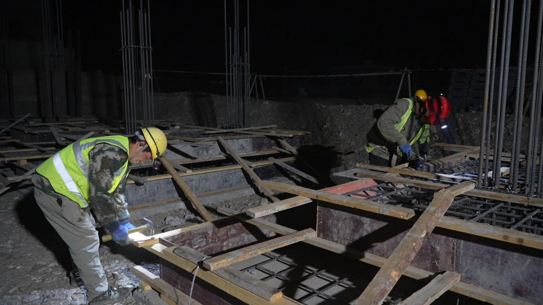 當夜幕籠罩村莊,大風呼嘯,旺加仍未歸家。他戴上安全帽,出現(xiàn)在燈火通明的工地。機械轟鳴,人聲交織。旺加仔細巡視基坑、鋼筋,履行監(jiān)督之責;順手遞工具,用帶著藏語腔調(diào)的漢語講著接地氣的笑話驅(qū)散疲憊。