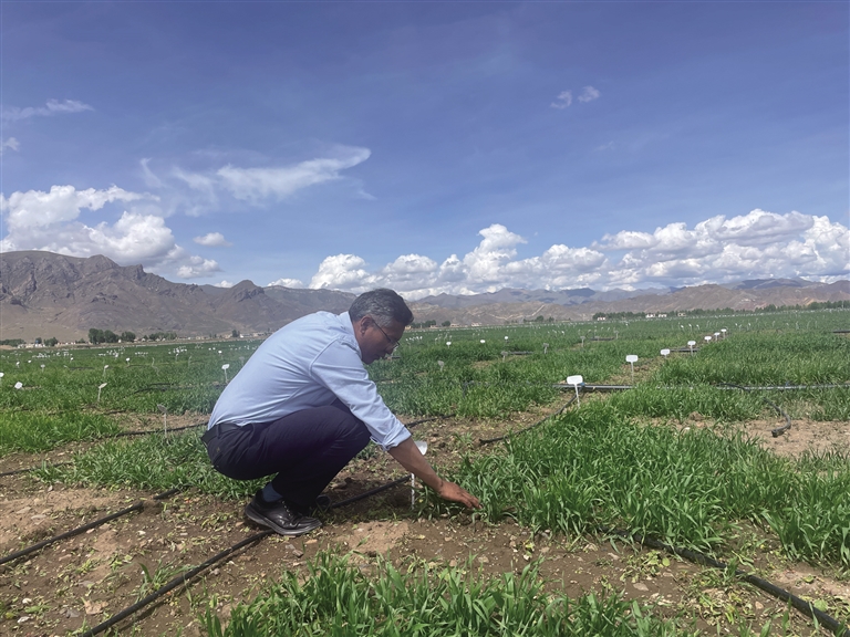 西藏自治區(qū)農牧科學院農業(yè)研究所副研究員達瓦頓珠在田里查看青稞長勢。