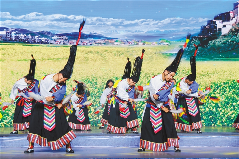 說唱《聲生不息》以鏗鏘有力的節(jié)奏,再現(xiàn)世界最長(zhǎng)史詩《格薩爾王傳》中降魔濟(jì)世的英雄傳奇;舞蹈《達(dá)姆韻》以工布響箭舞步、熱瑪琴伴奏,將對(duì)生活的熱愛、對(duì)自然的敬畏,化作熱烈奔放的舞步,演繹著傳承千年的文化記憶,彰顯著工布獨(dú)特的生命張力與文化自信;《扎西央恰》將千年宣舞與噶爾舞創(chuàng)新融合,以莊重舒緩的舞步訴說著高原先民對(duì)天地的敬畏,以雄渾激昂的鼓點(diǎn)展示雪域歷史的風(fēng)云激蕩,在莊重與激昂中訴說阿里高原的歷史變遷……