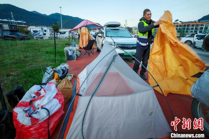 6月26日,摩旅理發(fā)師李秋實到達(dá)西藏林芝宇拓公園自駕露營地,搭建帳篷準(zhǔn)備過夜。中新社記者 江飛波 攝