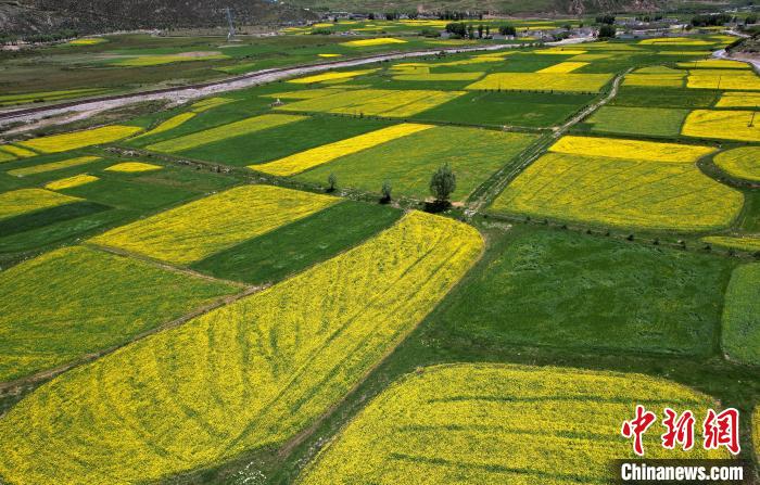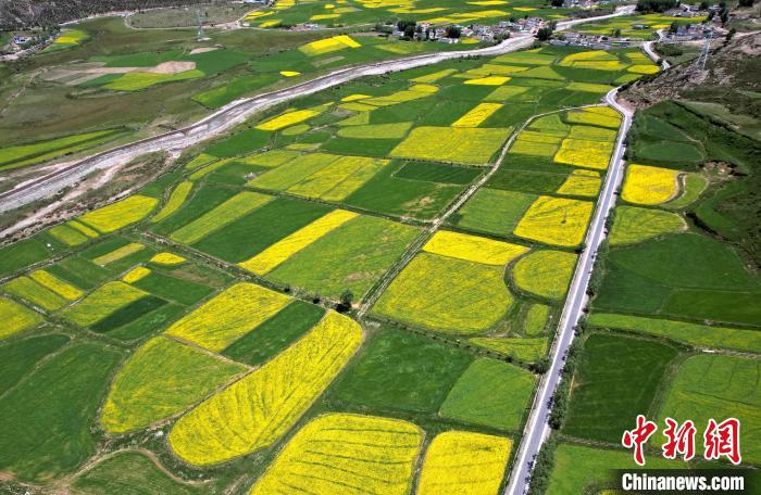 7月5日,西藏拉薩市墨竹工卡縣油菜花盛放。無(wú)人機(jī)航拍視角下,一塊塊金黃的油菜花田猶如大地的調(diào)色板,風(fēng)光宜人。(無(wú)人機(jī)照片)中新社記者 李林 攝