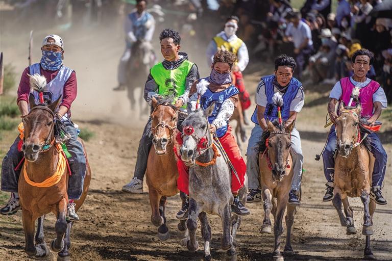 壓軸登場的8000米項目堪稱耐力與意志的較量。經(jīng)過前期比拼,參賽馬匹略顯疲憊,但騎手們依舊斗志昂揚。今年15歲的騎手旦達與座下駿馬“卡瓦隆達”配合默契,遙遙領(lǐng)先,甩開對手強勢奪冠,其余馬匹緊隨其后沖過終點。賽后,騎手旦達告訴記者:“我從小喜愛賽馬,每年都會參加各種賽馬活動,此前獲得了拉薩賽馬場8000米速度賽馬第一名,今天同樣取得了8000米速度賽馬第一名,很激動?!?/p>