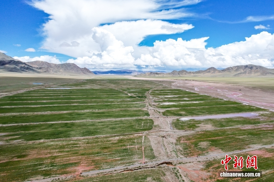 7月20日,航拍西藏阿里地區(qū)革吉縣文布當(dāng)桑鄉(xiāng)的人工種草基地。為解決當(dāng)?shù)囟旧笥貌堇щy,減輕天然草場(chǎng)壓力,2016年起文布當(dāng)桑鄉(xiāng)規(guī)劃建設(shè)人工種草基地。截至2024年,已種植人工草場(chǎng)3590畝,草業(yè)收入229.3萬(wàn)元人民幣,有效帶動(dòng)當(dāng)?shù)剞r(nóng)牧民就業(yè)創(chuàng)收和推動(dòng)生態(tài)可持續(xù)發(fā)展。(無人機(jī)照片)中新社記者 張祥毅 攝