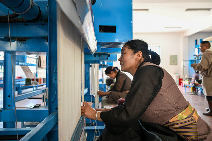 旦增稱來正在檢查染色后的紗線。新華社記者 李鑫 攝