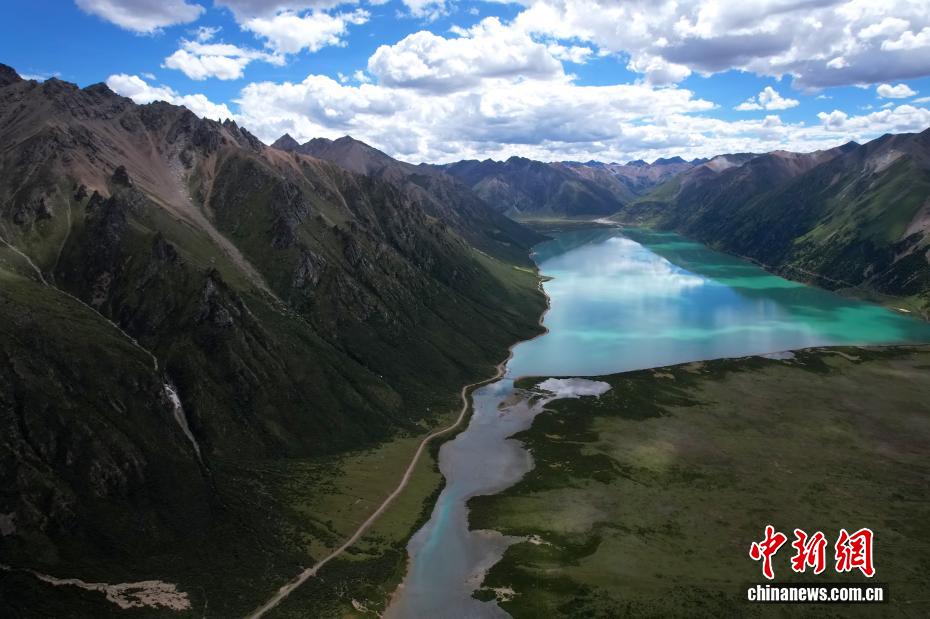 7月21日,嘉乃玉錯(cuò)景色。嘉乃玉錯(cuò)國家濕地公園位于西藏那曲市嘉黎縣境內(nèi)。夏日,嘉乃玉錯(cuò)碧波蕩漾,湖邊綠意盎然,在藍(lán)天白云映襯下,景色如畫。(無人機(jī)照片)中新社記者 李林 攝