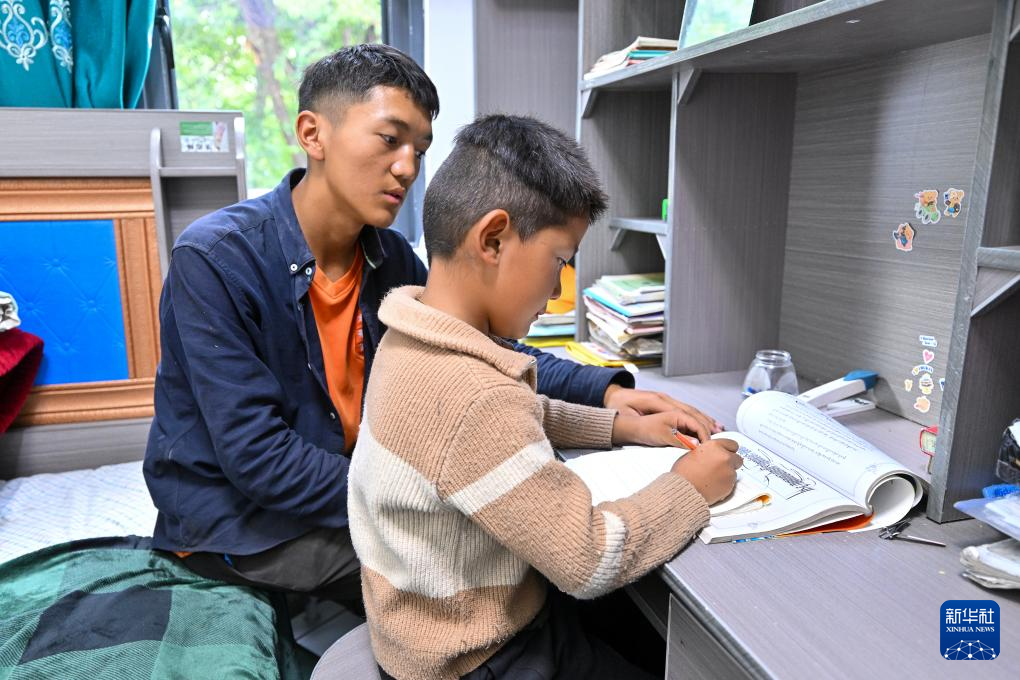 7月21日,17歲的米瑪次仁(左)在新房臥室內(nèi)輔導(dǎo)7歲的弟弟堅(jiān)阿達(dá)瓦寫(xiě)作業(yè)。新華社記者 李鑫 攝