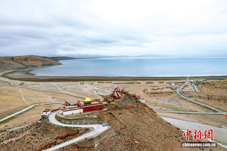 7月22日,從吉吾寺上空航拍瑪旁雍錯(cuò)?,斉杂哄e(cuò)與拉昂錯(cuò)位于西藏阿里地區(qū)普蘭縣境內(nèi),兩湖僅有一堤之隔,卻擁有不同的地理特征和咸淡水之分,因而分別被譽(yù)為“圣湖”與“鬼湖”。(無人機(jī)照片)中新社記者 張祥毅 攝