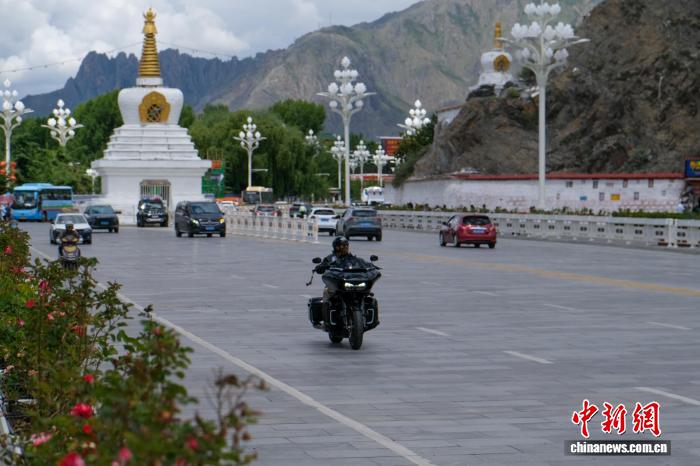 7月21日,一位騎士騎著重型摩托車(chē)途經(jīng)拉薩北京中路白塔附近。中新社記者 江飛波 攝