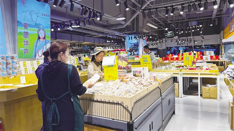 除了家電賣場,特產(chǎn)超市也迎來了消費熱潮。在位于拉薩市濱河路乃倉廣場負一樓的藏匯倉·西藏特產(chǎn)倉儲超市(乃倉總店),前來選購特產(chǎn)的消費者絡繹不絕,貨架前時常排起長隊。該超市負責人李紅容笑著說:“今年上半年的客流量和銷售額都比去年同期上漲了不少,像牦牛肉干、藏香、青稞制品這些特色產(chǎn)品特別受歡迎。一方面是本地市民買回去自己吃或者送給外地朋友;另一方面很多游客也會專門過來采購,把西藏的味道帶回去?,F(xiàn)在物流方便,我們還開通了快遞直發(fā)服務,不少消費者在線上下單,店里的線上訂單量每個月都在增加。為了滿足消費者需求,我們還增加了產(chǎn)品種類,光是青稞制品就有青稞餅干、青稞麥片、青稞酒等二十多個品種?!?/p>