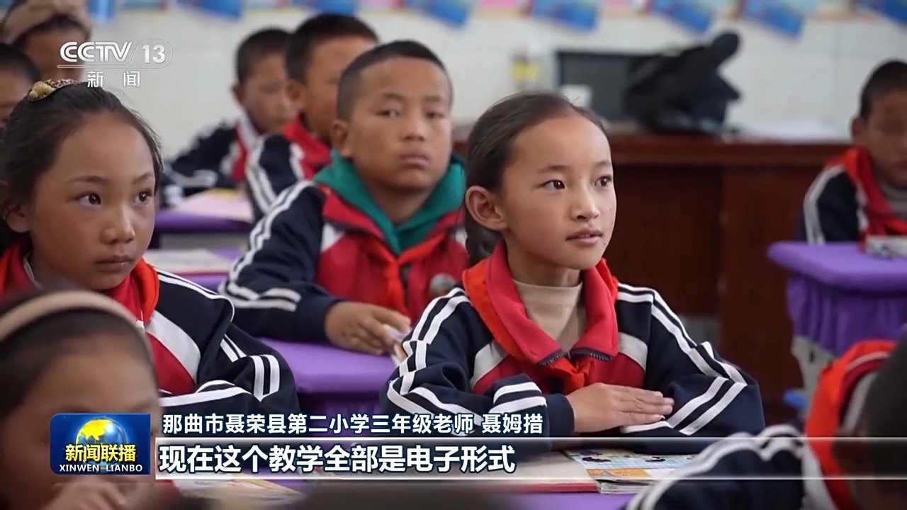 那曲市聶榮縣第二小學三年級老師 聶姆措:變化特別大,以前鄉(xiāng)鎮(zhèn)里面都是帳篷學校,黑板就是這么小的一個木板,冬天帳篷里面的話,手腳都是凍著的。現(xiàn)在這個教學全部是電子形式,條件特別好。
