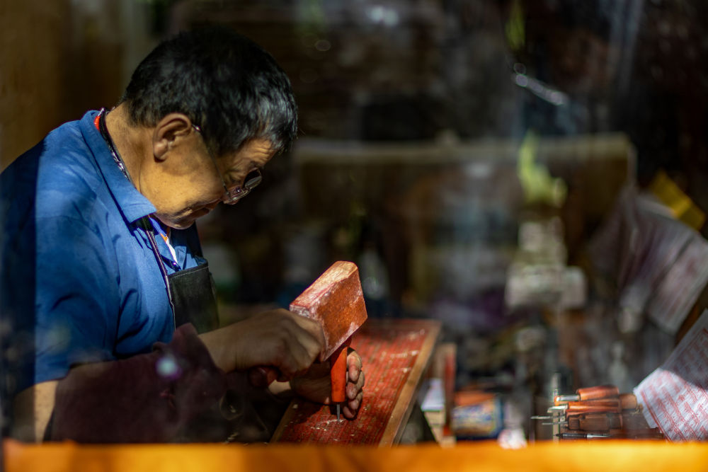 8月6日,雕刻師在工作中。西藏雪巴康雕版印刷制作技藝入選西藏自治區(qū)級非物質(zhì)文化遺產(chǎn)代表性項目名錄。