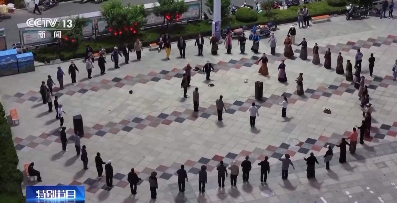 傍晚時(shí)分,社區(qū)居民吃過晚飯就會來到廣場,圍在一起跳起藏式廣場舞“鍋莊”。
