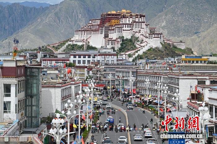 2025年8月18日,隨著西藏自治區(qū)成立60周年大慶臨近,拉薩街頭處處洋溢著喜慶氛圍。圖為市區(qū)主干道上懸掛的彩旗。中新社記者 貢嘎來(lái)松 攝